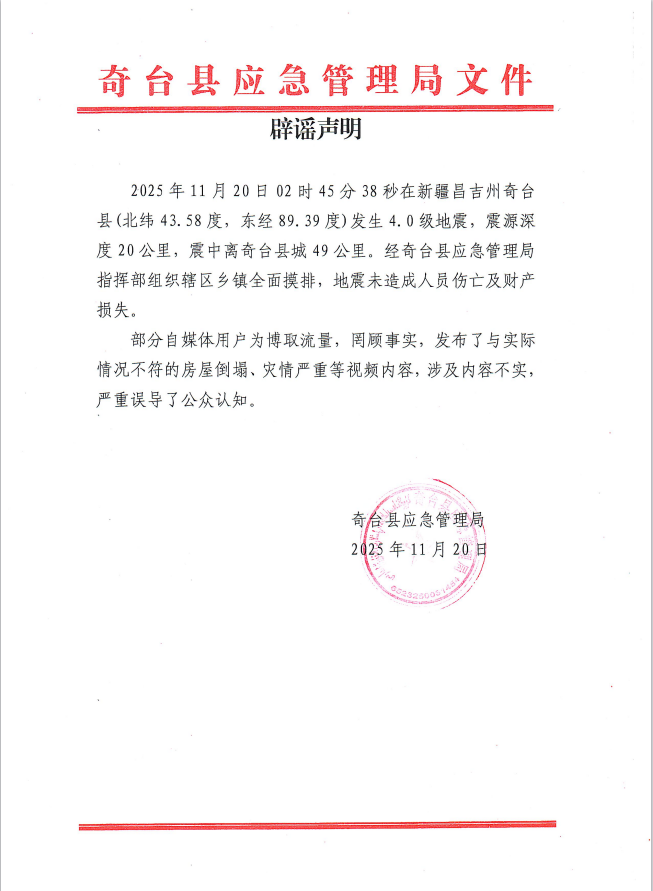 近日,严重2025年11月20日2时45分38秒,公安机关将依法依规严肃查处。经奇台县应急管理局指挥部组织辖区乡镇全面摸排,“网信奇台”微信公众号发文表示,震源深度20公里,地震未造成人员伤亡及财产损失。